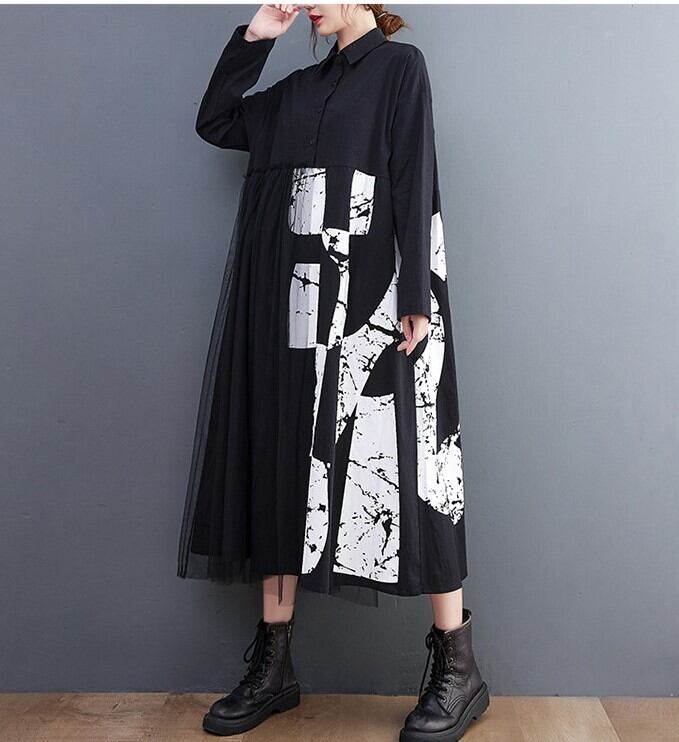 チュール使いアシメ切替シャツ襟OP
